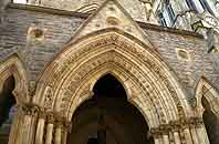St. George’s opened in 1843 to accommodate the overflow ("chapel of ease") from Christ Church Cathedral and was first located on what is now Notre Dame Street, just outside the city walls. The present building was opened for worship on October 9, 1870. Its main features include the magnificent double hammer-beam roof (one of the largest of its type in the world) the unique column-free interior which combines elements of both English and French Gothic plans, and the superb English wood-carving in the chancel. |